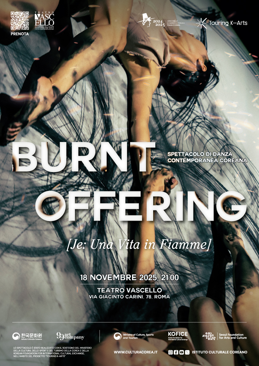 La compagnia coreana 99artcompany porta in scena anche a Roma, il 18 novembre 2025, Burnt Offering [Je: Una Vita in Fiamme], una performance che indaga i nuovi rituali della nostra epoca e il desiderio universale di significato e spiritualità.